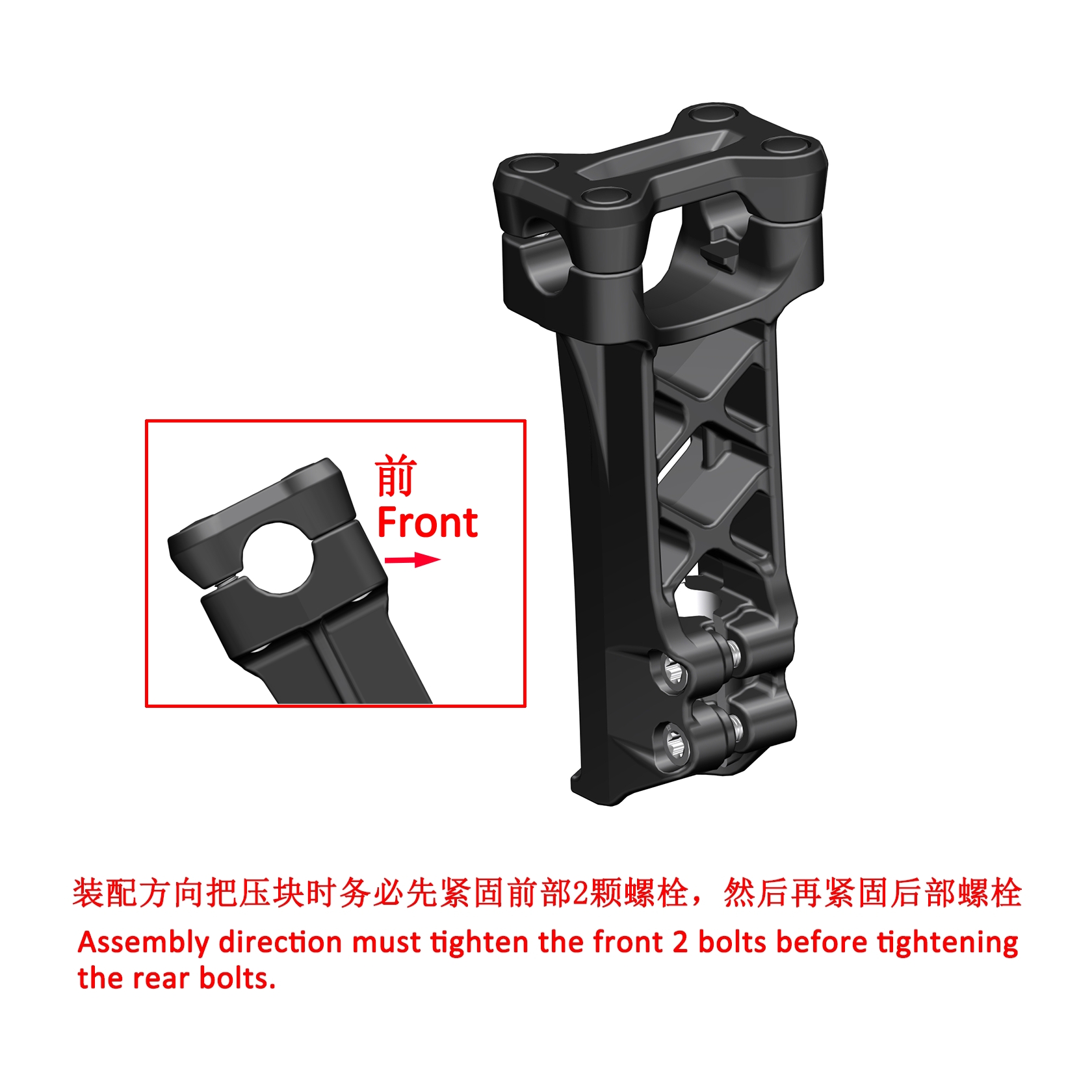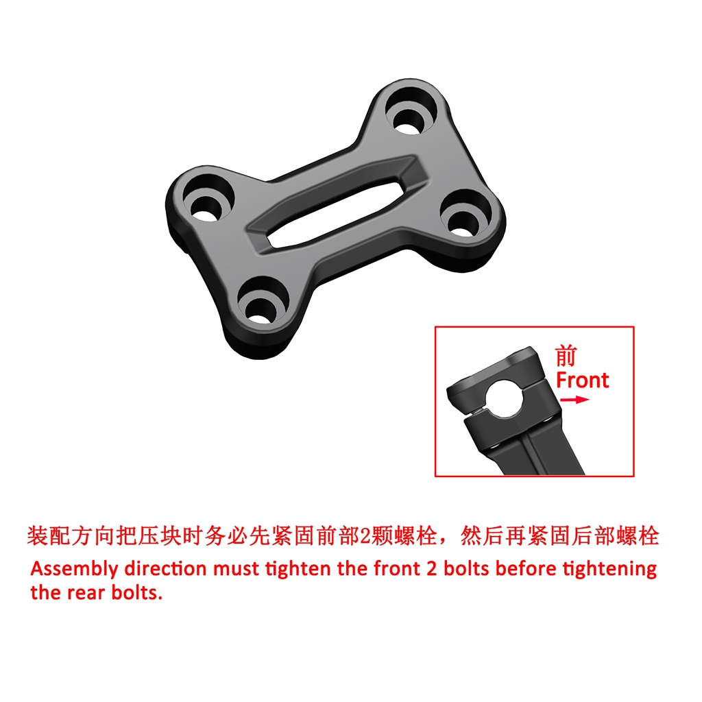 Note: During assembly, the two front bolts must be tightened first, followed by the bolts at the rear (near the driver''s end). Diagonal tightening is prohibited, as it may damage the pressure block and void the warranty.